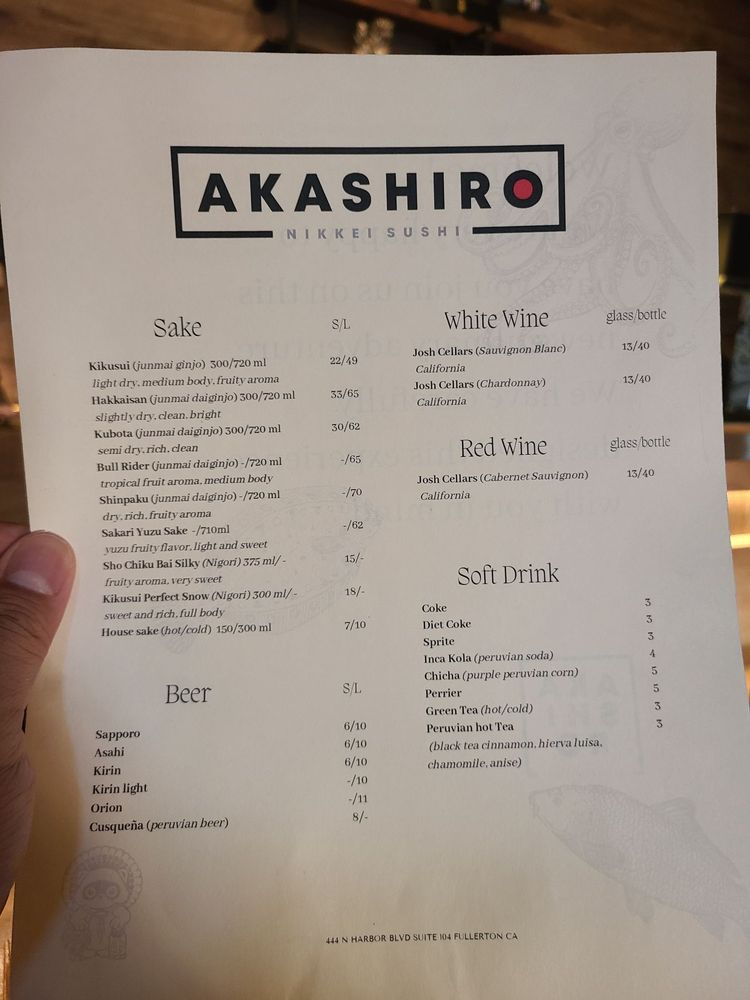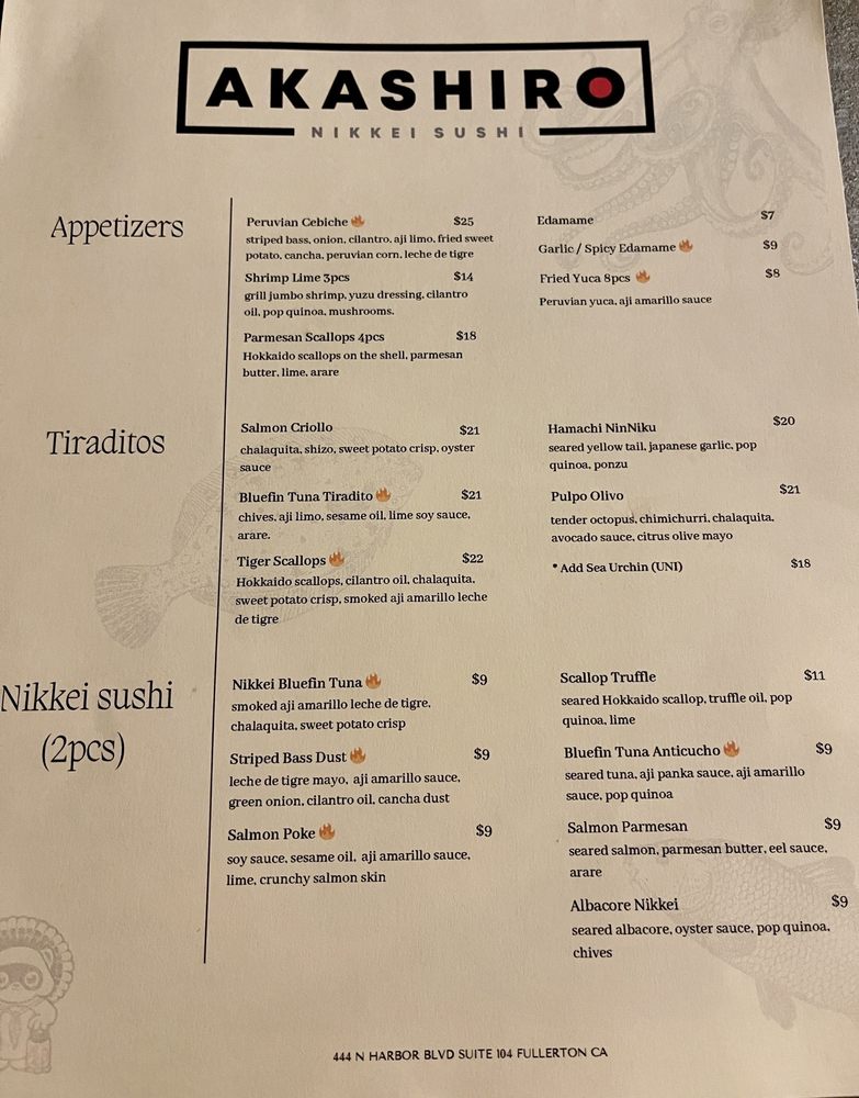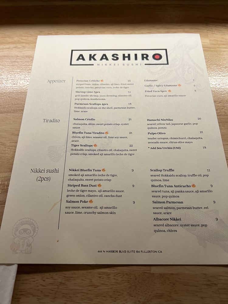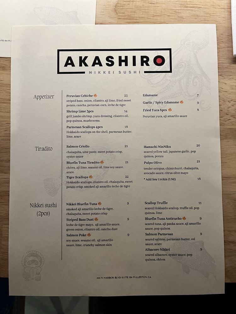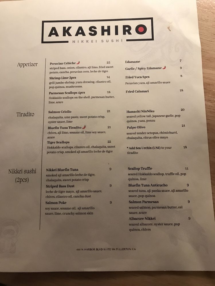 Akashiro Nikkei Sushi Peruvian / Japanese Menu