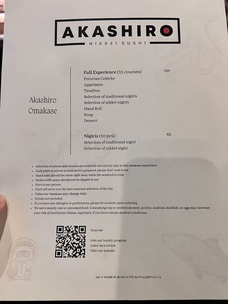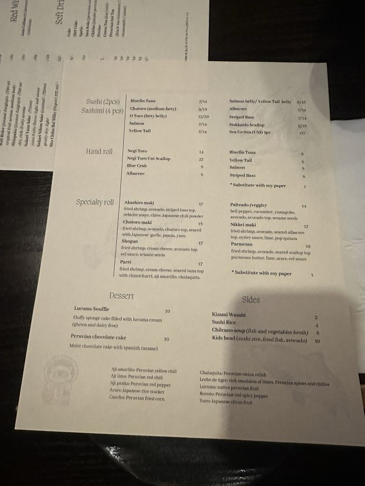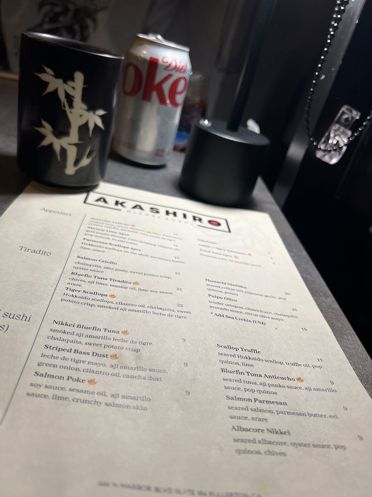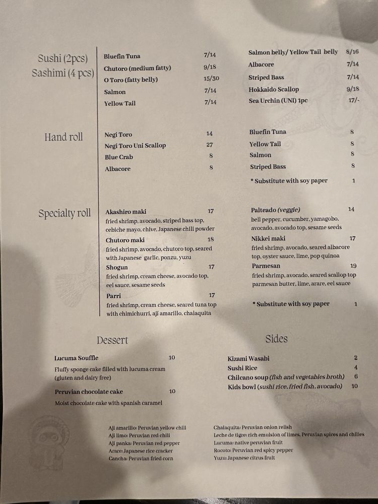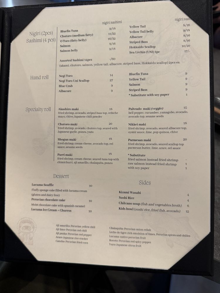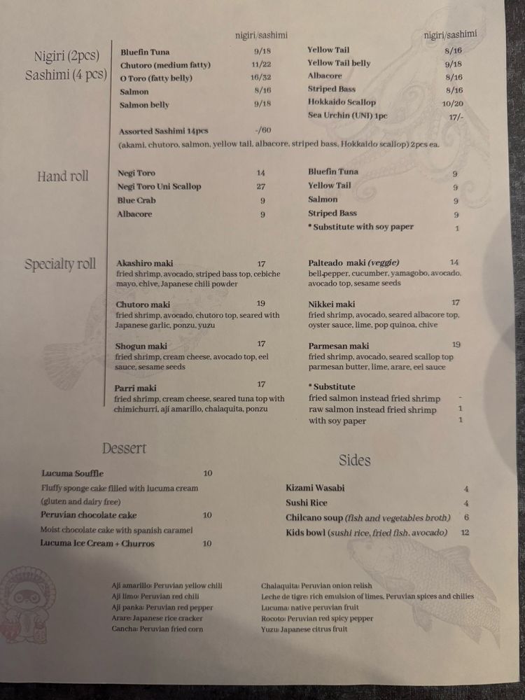 Akashiro Nikkei Sushi Peruvian / Japanese Menu
